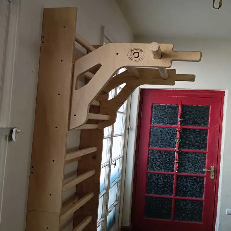 La espaldera de madera modular Mosquetón es un equipo de entrenamiento versátil y resistente, diseñado para uso en el hogar, departamentos o centros de entrenamiento. Su estructura está fabricada en dos secciones desmontables, lo que facilita el transporte, montaje e instalación en distintos espacios.