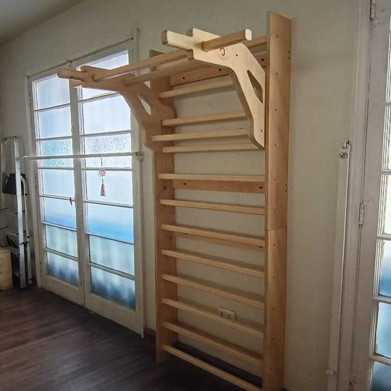 Espaldera de madera modular de 220×70 cm, fabricada en dos partes para fácil instalación. Cuenta con cabezal ajustable y estructura resistente, ideal para entrenamiento funcional, movilidad y uso en casa o centros deportivos.